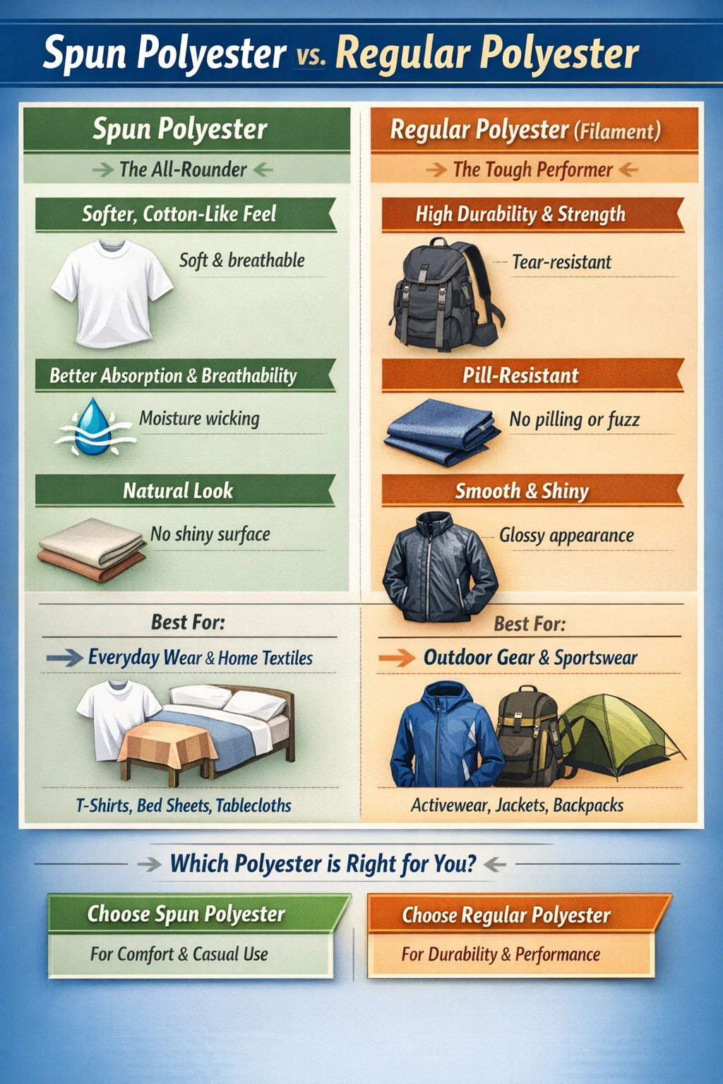 Choose "Spun Polyester": If you're buying everyday T-shirts, bed sheets, or tablecloths. It provides a skin-friendly feel similar to cotton, while also being easy to wash, quick-drying, and wrinkle-resistant like polyester.