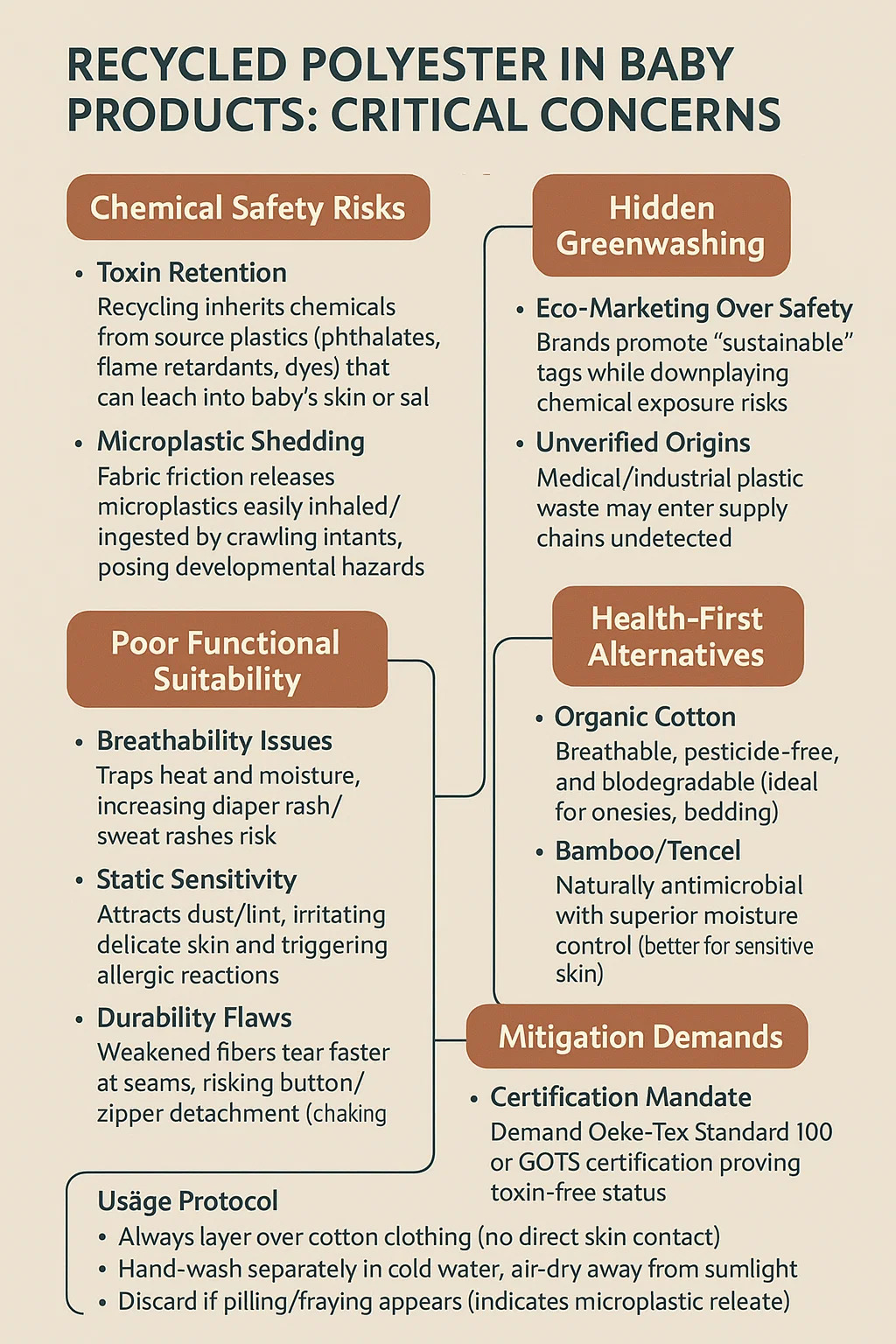 Recycled Polyester Limits: Only acceptable in non-contact items (stroller covers, car seat shells) with cotton inner lining.