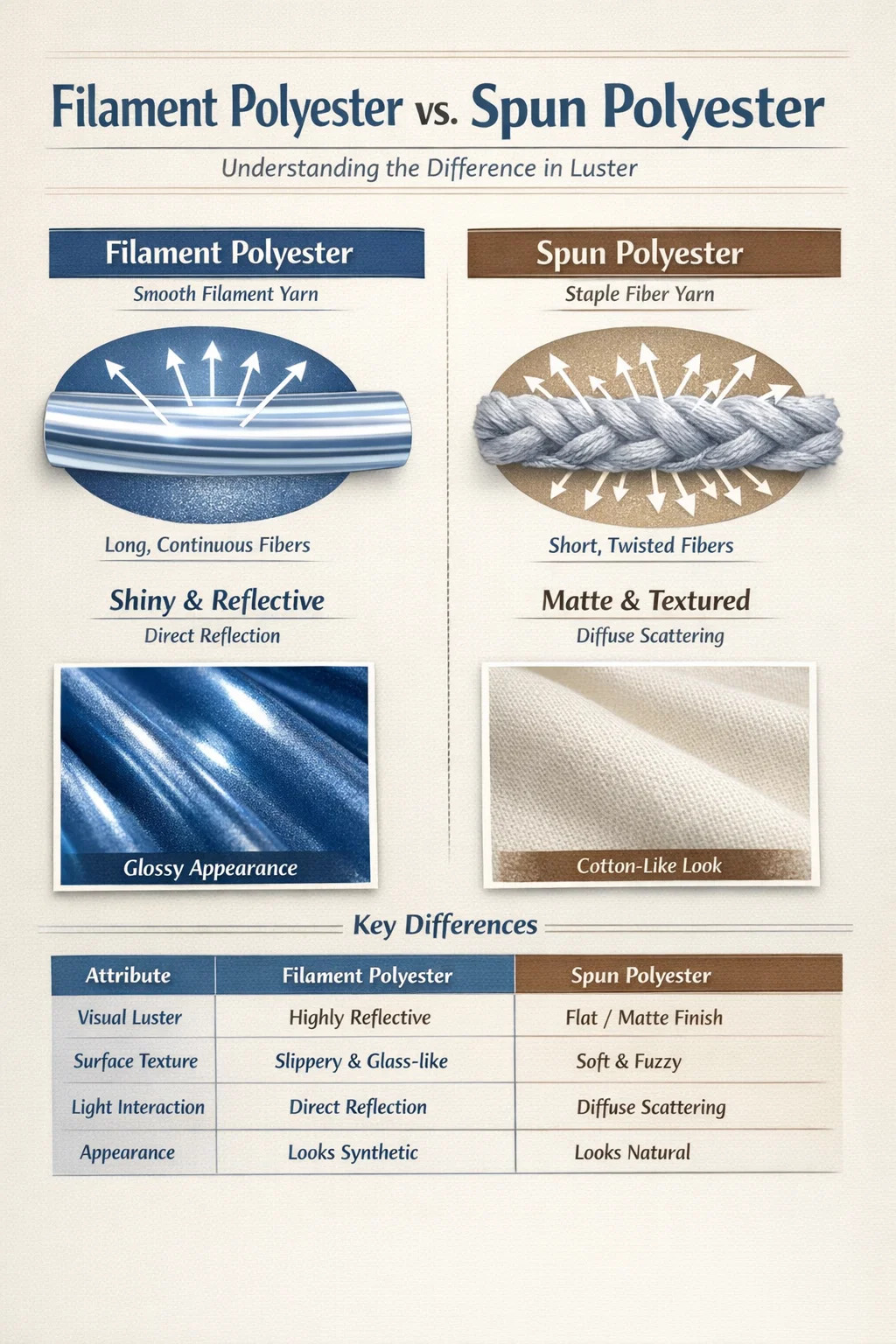 Content No, spun polyester is not shiny. Unlike standard filament polyester, which is known for its high-gloss, plastic-like sheen, spun polyester is specifically engineered to have a matte finish. It mimics the appearance of natural fibers like cotton or linen. If you are looking for a fabric that looks organic and dull rather than reflective and synthetic, spun polyester is the ideal choice. To understand why spun polyester lacks shine, we have to look at how the yarn is constructed. Standard polyester is made of "filament" fibers—long, continuous, and perfectly smooth strands. These smooth surfaces act like microscopic mirrors, reflecting light directly back to the eye, which creates a noticeable "shine." In the production of spun polyester, these long filaments are chopped into short "staple" lengths. These short bits are then twisted together to form a thread. This twisting process creates an irregular, bumpy surface with thousands of tiny fiber ends poking out. When light hits this uneven surface, it is scattered in many different directions (diffuse reflection) rather than reflected in a straight line. This scattering of light is what makes the fabric appear matte. The visual difference between these two types of polyester is quite dramatic, affecting how they are used in various industries. The lack of shine in spun polyester makes it highly desirable for specific applications where a "cheap" or "plastic" look must be avoided. In the world of professional event planning, tablecloths and napkins are almost exclusively made of spun polyester. A shiny filament tablecloth can look tacky under bright ballroom lights and is often too slippery for guests. Spun polyester stays in place, looks like expensive cotton, and photographs beautifully because it doesn't create harsh glare. Fashion designers use spun polyester for casual wear like T-shirts and polo shirts. The matte finish gives the garment a "high-end" cotton look, while retaining the moisture-wicking and wrinkle-resistant benefits of polyester. It allows the wearer to benefit from synthetic performance without looking like they are wearing a gym jersey. A common concern is whether the matte finish of spun polyester will wear off over time, revealing a synthetic shine. Because the matte look is a result of the physical structure of the yarn (the twisting of fibers) and not a chemical coating, it is permanently non-shiny. In summary, if your goal is to avoid the synthetic glint of traditional polyester, spun polyester is the perfect textile solution. It provides the sophisticated, flat look of cotton with the heavy-duty performance of an engineered fiber.Direct Answer: The Luster of Spun Polyester