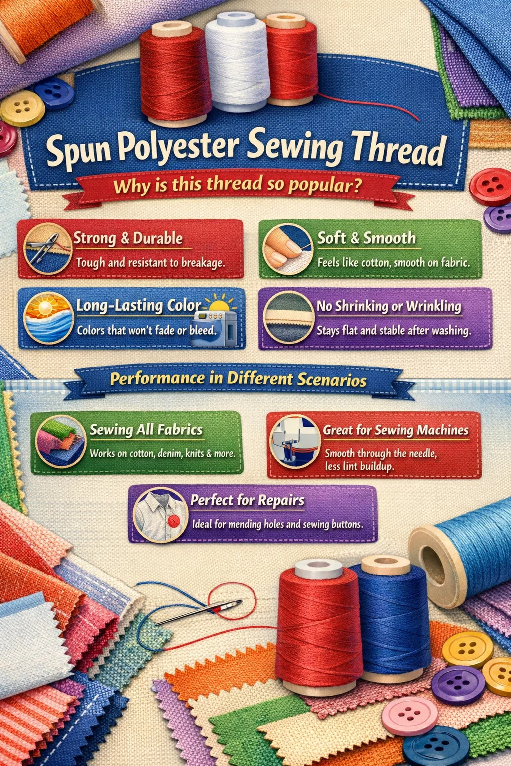 Although spun polyester feels soft like cotton thread, it inherits the strength of polyester. Whether you're using a sewing machine at high speed or doing hand sewing, it's not easy to break and can withstand the daily wear and tear of clothing.