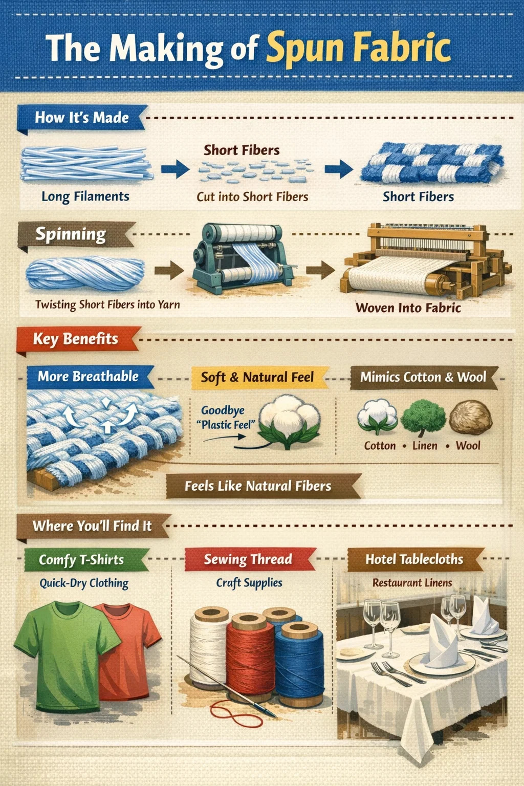 Typically, synthetic fibers like polyester initially come as long, smooth filaments, similar to fishing line. However, to make them feel more comfortable, they are "broken down and reassembled," resulting in spun fabric.