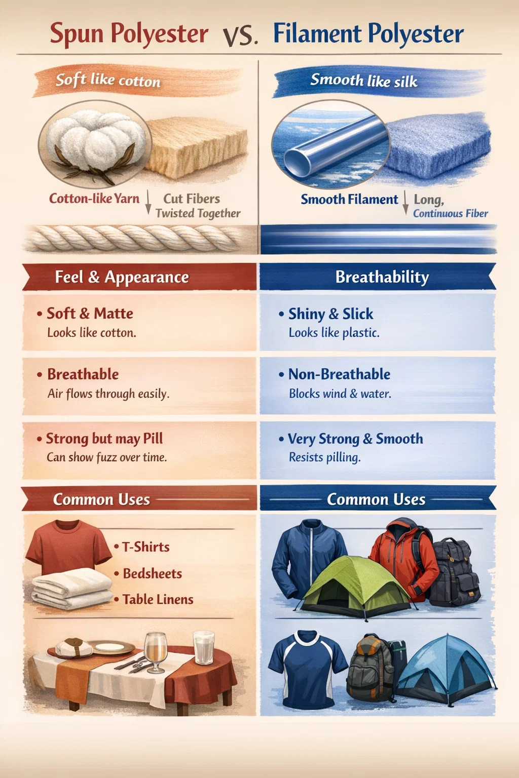 To explain the difference between these two fabrics, we can use an analogy: filament polyester is like a long, smooth "fishing line," while spun polyester is made by cutting these "fishing lines," loosening them, and then twisting them back together into a thread like "cotton rope."